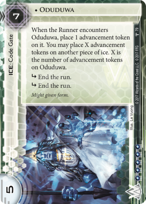 The flavor text of Susanoo-no-Mikoto referenced so called “god” ice, and giant ice with powerful effects inspired by deities has been a noticeable cycle throughout the history of the game. I love god ice. Oduduwa is a wonderful addition to the Netrunner pantheon, and I look forward to putting in in my Weyland decks in places it doesn’t belong, and spending way too much influence to play it in Tennin.